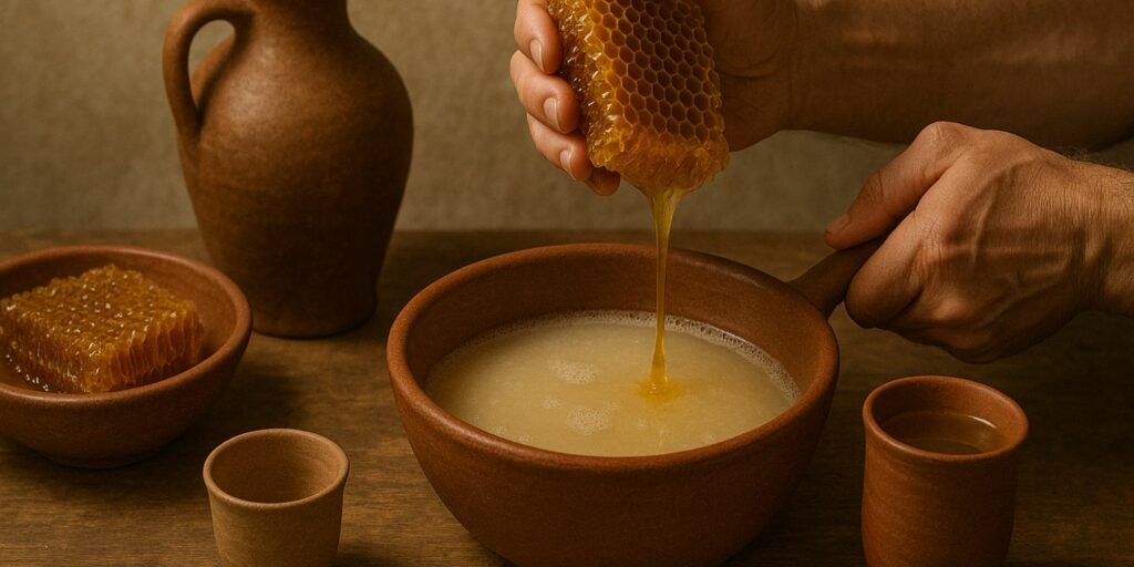 L’hydromel était connu et consommé bien avant l’époque romaine, mais il restait apprécié dans tout l’Empire pour son goût sucré et sa fermentation légère. Il était fabriqué en mélangeant du miel avec de l’eau, puis en laissant fermenter le tout pendant plusieurs jours ou semaines. Cette boisson alcoolisée, douce et parfumée, convenait aussi bien aux festins qu’aux usages rituels. Elle symbolisait souvent un lien avec les dieux et la nature.