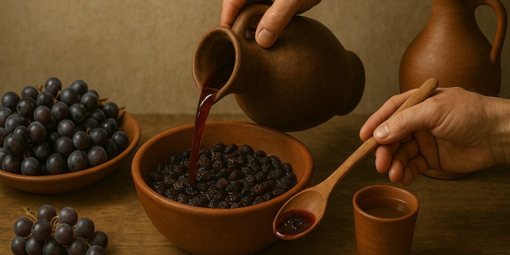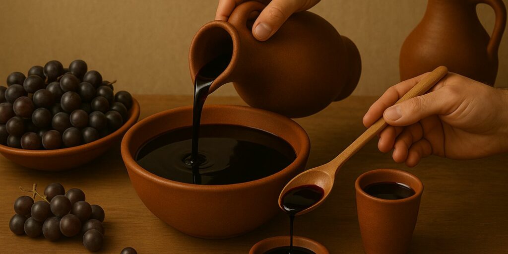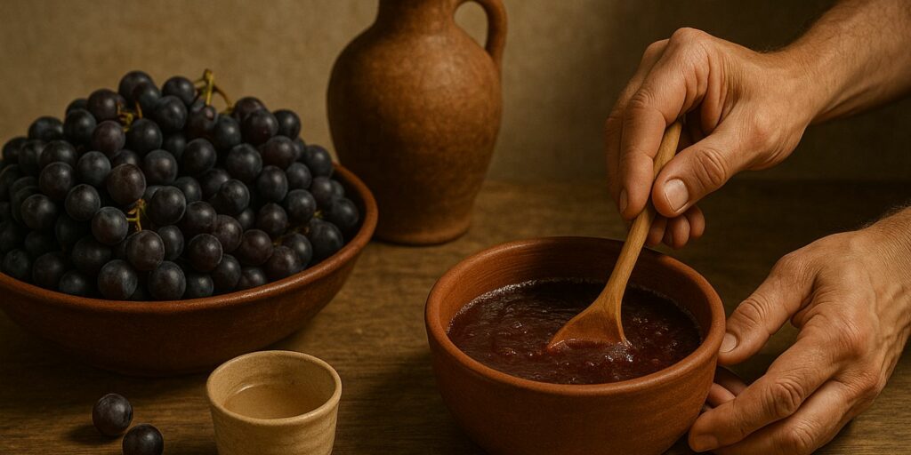 Le defrutum était obtenu par cuisson prolongée du moût de raisin jusqu’à obtention d’un liquide épais et sucré. Il était utilisé comme édulcorant dans de nombreuses recettes, aussi bien culinaires que médicinales. Cette réduction de raisin permettait de conserver les arômes du fruit tout en concentrant les sucres naturels. C’était un ingrédient essentiel dans la cuisine romaine, notamment dans les sauces et les desserts.