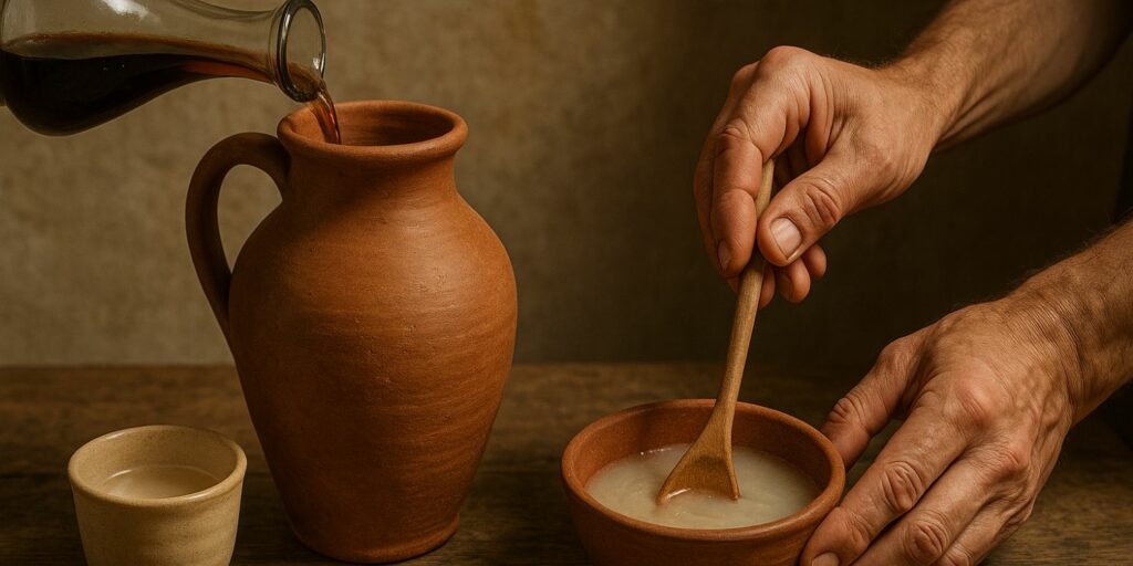 La posca était une boisson simple et acide, obtenue en mélangeant de l’eau avec du vinaigre de vin. Elle était particulièrement répandue chez les soldats romains, qui l’emportaient durant les campagnes militaires. Sa forte acidité permettait de purifier l’eau, souvent impropre à la consommation directe. Elle apportait également un goût plus supportable que celui de l’eau stagnante, en particulier durant les longues marches.