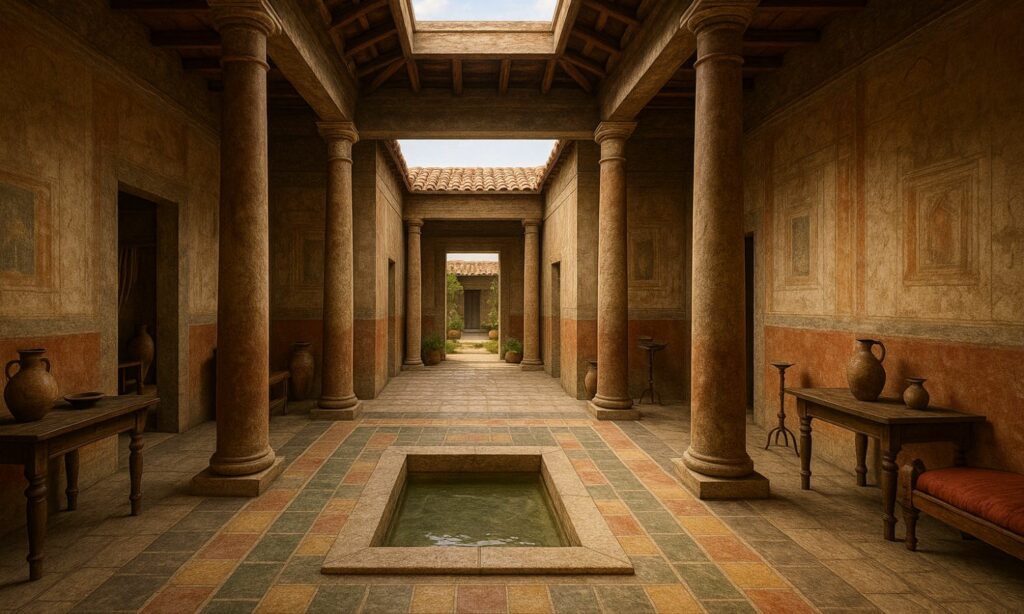 L’atrium était une vaste salle ouverte sur le ciel grâce à une ouverture pratiquée dans le toit, appelée compluvium. Ce dispositif laissait entrer la lumière naturelle et l’air frais, créant un lieu à la fois lumineux et vivant. C’était le cœur respirant de la maison, où se croisaient les membres de la famille et les visiteurs.