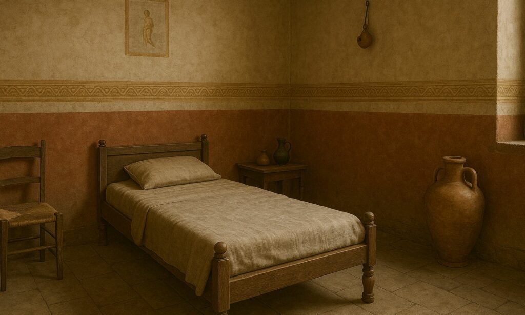 Le cubiculum était une pièce de taille modeste, souvent dépourvue de fenêtre pour préserver la fraîcheur et l’intimité. Son aménagement se limitait à un lit, quelques coffres et une lampe.