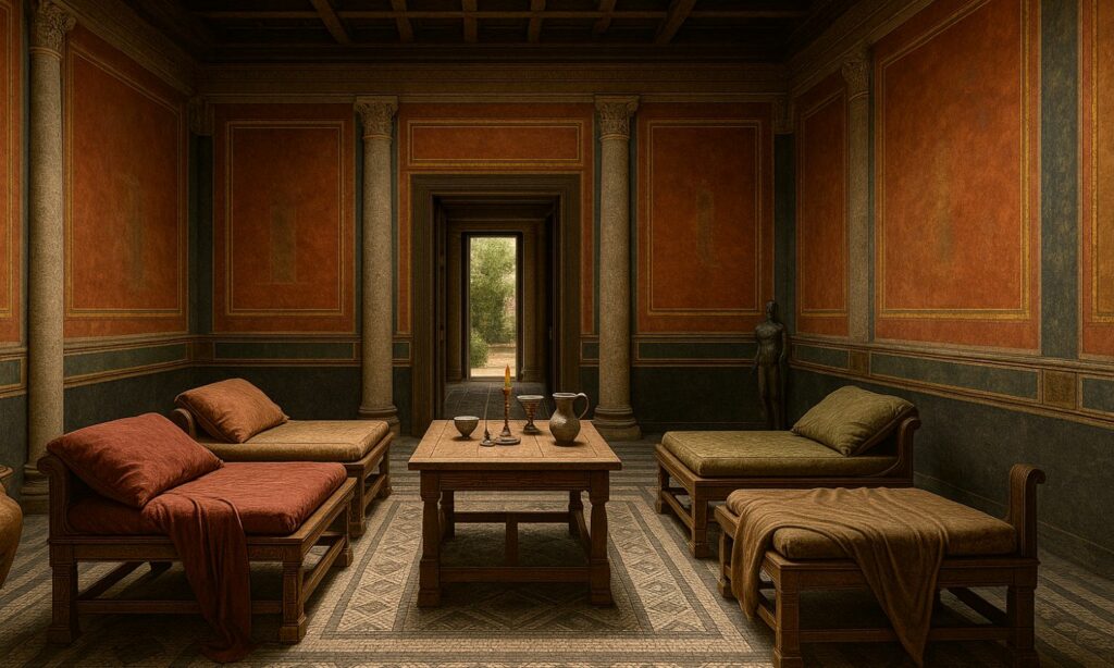 Plus qu’un simple lieu de repas, le triclinium représentait le théâtre du pouvoir social. On y montrait sa richesse, son goût et sa capacité à recevoir avec faste.
