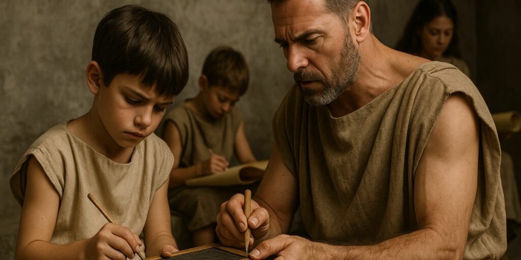 Les élèves répétaient les lettres à haute voix, traçaient les mots sur des tablettes de cire et récitaient leurs leçons. Le litterator, strict mais essentiel, posait les premières pierres de la connaissance.