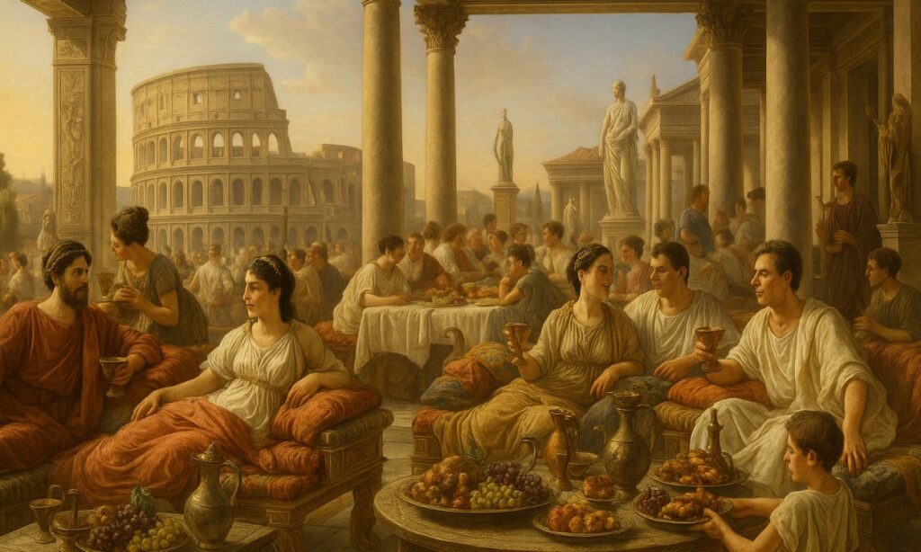 Les banquets, appelés convivium, étaient des moments de prestige pour les familles nobles. On y servait des mets raffinés, des vins rares, et des divertissements comme des poètes, danseurs ou musiciens.