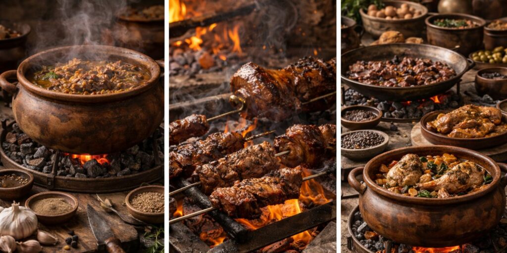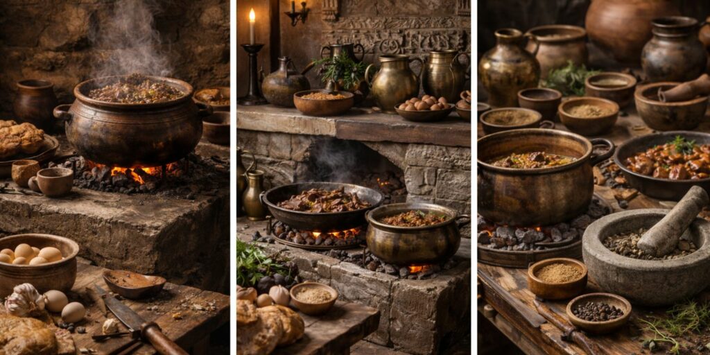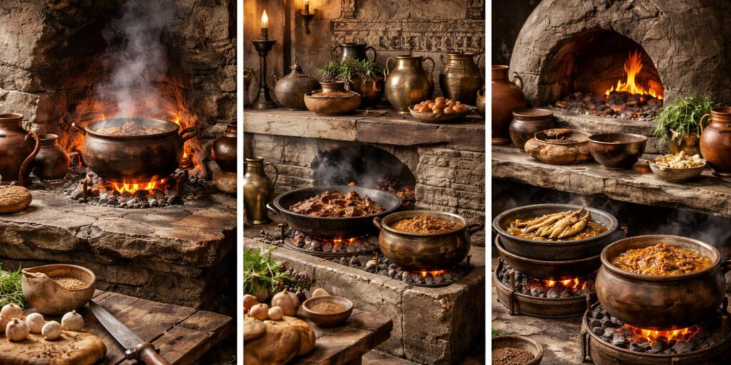 Les aliments étaient cuits directement au-dessus des flammes ou dans des pots posés sur des supports. Cette méthode demandait une certaine maîtrise pour éviter de brûler les plats. Les Romains savaient ajuster la distance entre le feu et les aliments. Cela influençait directement le résultat final.