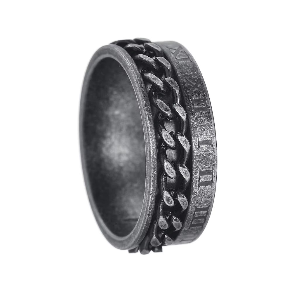 Cette bague impressionne par son épaisseur et ses finitions volontairement patinées. La chaîne centrale donne du relief au bijou, tandis que les chiffres romains gravés en périphérie apportent une structure équilibrée. Elle se distingue par son style rustique, presque archaïque, qui rappelle les anneaux portés par les soldats et centurions.