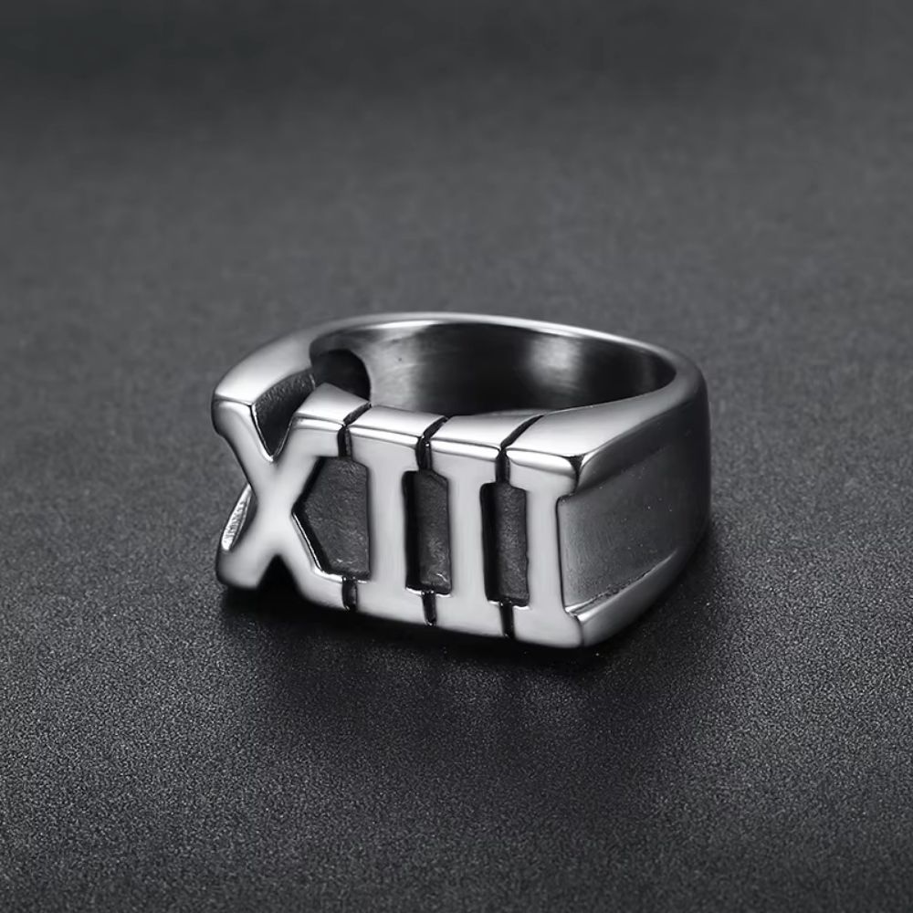 Cette bague en acier inoxydable brossé se distingue par son aspect solide et sa forme large, qui épouse parfaitement la main. Le chiffre romain XIII semble découpé dans le métal, lui conférant un aspect presque architectural. La surface mate du bijou lui donne un style brut, masculin, sans fioritures, mais chargé de sens. Une véritable déclaration de style qui traverse les époques sans perdre de sa puissance.