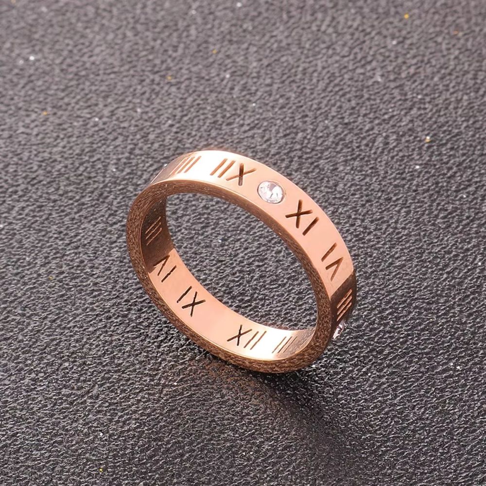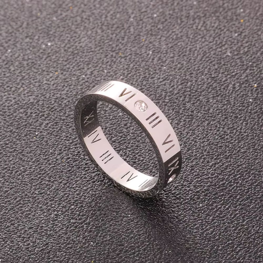 Son anneau fin épouse le doigt avec légèreté, tout en conservant une présence marquée grâce à ses gravures précises en chiffres romains. Le petit cristal inséré subtilement entre les symboles ajoute une touche de brillance sans excès. Qu’elle soit en version argentée ou rosée, cette bague capture la lumière et les regards, sans jamais en faire trop.