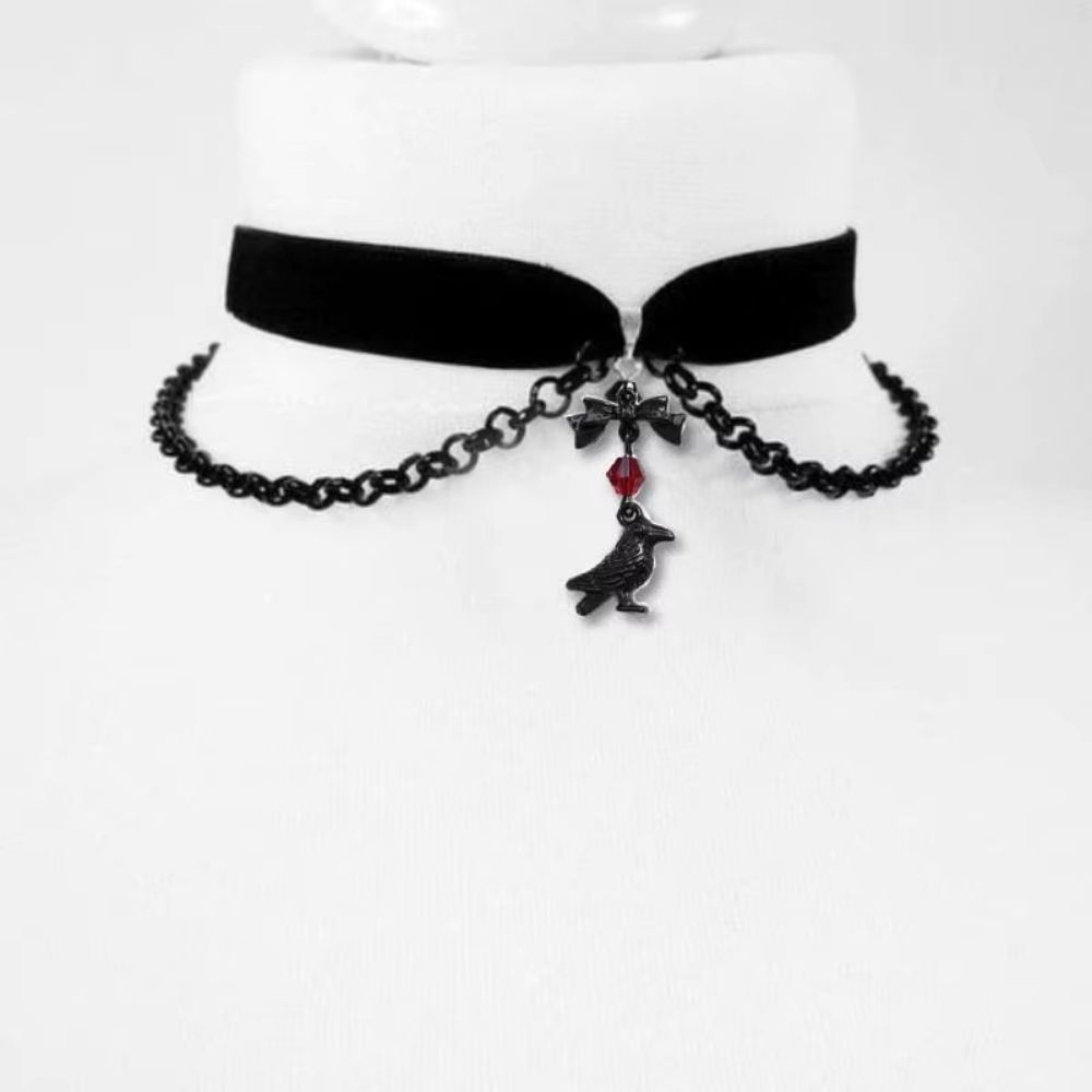 Le corbeau, messager des anciens mythes, symbole de sagesse et de mort, est ici revisité dans un design délicat mais chargé d’intensité. Il pend sous un nœud décoratif et une perle rouge, ajoutant une touche dramatique au collier. La chaîne noire, légère et mobile, accentue le contraste entre la douceur du velours et la dureté symbolique du pendentif.