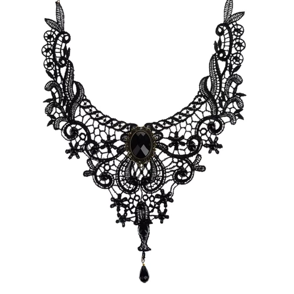 Ce collier antique en dentelle noire est une véritable déclaration de style, mêlant mystère, élégance et romantisme ténébreux. Avec son large plastron orné d’un médaillon central façon pierre d’onyx, il transforme instantanément une tenue sobre en un look saisissant. Les perles noires et les gouttes pendantes ajoutent une touche dramatique, pour un bijou inspiré d’un autre temps.