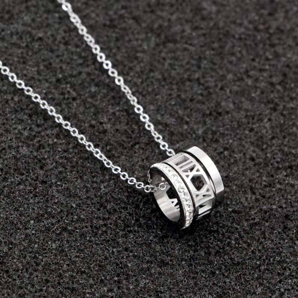 Ce collier moderne à trois anneaux joue sur les contrastes pour offrir un bijou unique et élégant. L’un des anneaux est ajouré de chiffres romains, rappelant l’héritage culturel et l’esthétique rigoureuse de l’Antiquité. Le tout monté sur une fine chaîne argentée, pour un rendu minimaliste mais symbolique.
