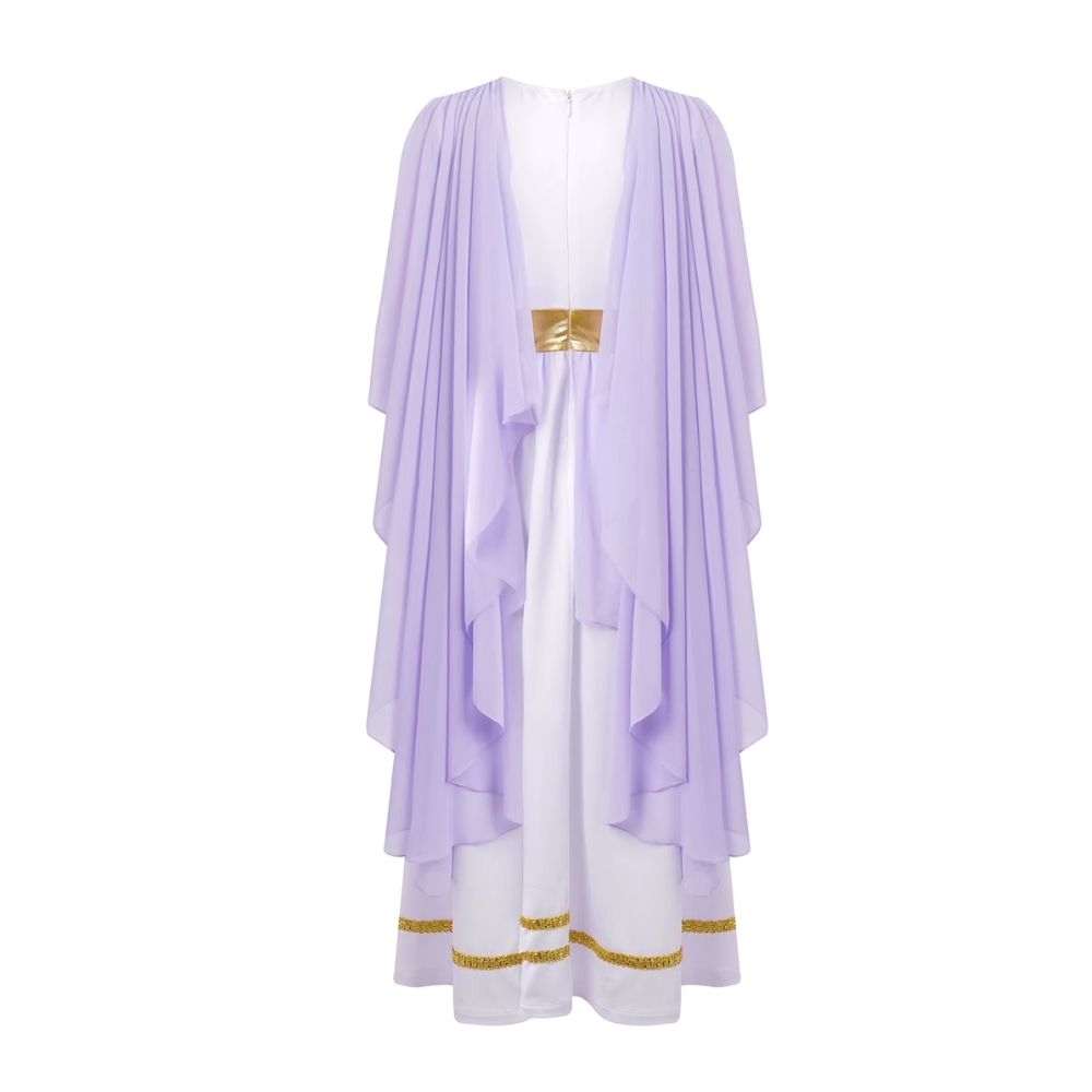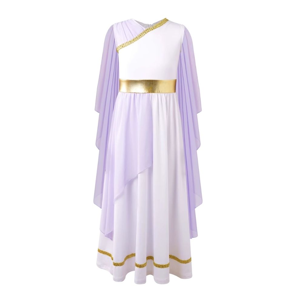 Cette robe d’inspiration antique aux tons blancs et violets transporte les jeunes filles dans un univers de légendes et de mythologie. Elle combine élégance classique et confort moderne, parfaite pour une représentation ou un déguisement.