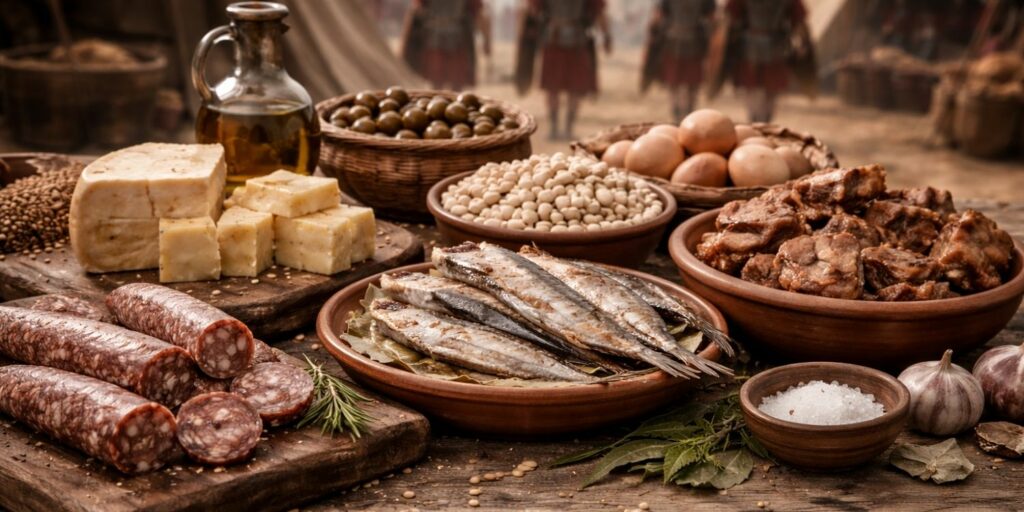 Si les céréales dominaient les rations, les soldats romains ne se limitaient pas aux glucides. Les protéines étaient indispensables pour soutenir l’effort physique et la récupération. La viande, le poisson et le fromage complétaient leur alimentation selon les circonstances. Explorons ces sources de protéines qui renforçaient les légions.