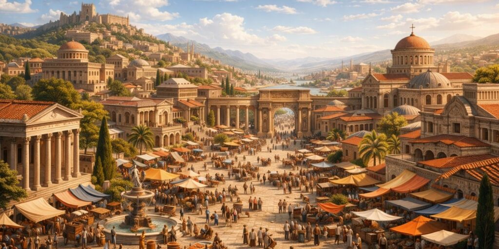 Capitale de l’Empire byzantin, elle surpassa Rome en influence pendant des siècles. Constantinople est restée une référence en matière d’administration, d’urbanisme et de culture jusqu’à sa chute en 1453. Elle illustre la capacité du monde romain à se transformer et à durer bien au-delà de l’Antiquité.