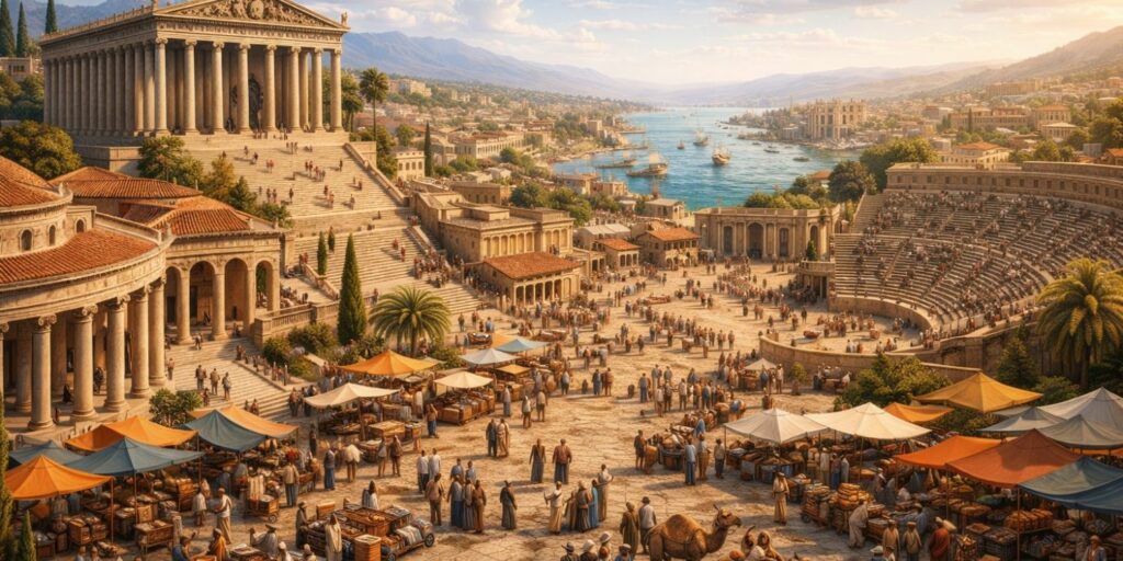 Située en Égypte, Alexandrie fut fondée par Alexandre le Grand et devint rapidement l’une des plus grandes villes de l’Empire. Elle était un carrefour commercial reliant l’Afrique, l’Asie et l’Europe. Son port très actif permettait l’exportation massive de céréales et de produits exotiques. Grâce à sa position stratégique, Alexandrie prospéra économiquement pendant des siècles.