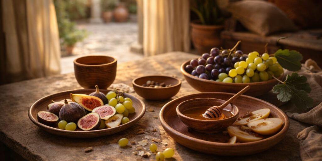 Les figues, raisins, pommes ou poires étaient ainsi dégustés nature, parfois accompagnés de miel ou de vin sucré. Ce moment de fraîcheur était très apprécié, surtout lors des repas estivaux.