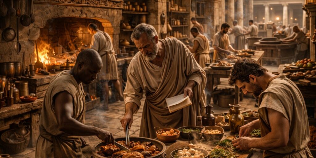 Les cuisines des grandes maisons romaines fonctionnaient selon une hiérarchie bien définie. Au sommet se trouvait le coquus, suivi par d’autres esclaves aux tâches spécifiques. Cette organisation permettait de gérer efficacement la préparation des repas. Chacun savait exactement ce qu’il devait faire.