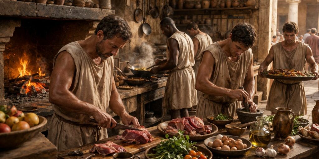 Les esclaves affectés à la cuisine pouvaient être nombreux et spécialisés. Certains s’occupaient de la cuisson, d’autres de la préparation des ingrédients ou du service. Cette division du travail permettait une plus grande efficacité et des plats plus élaborés. Les repas pouvaient ainsi devenir de véritables démonstrations de richesse.