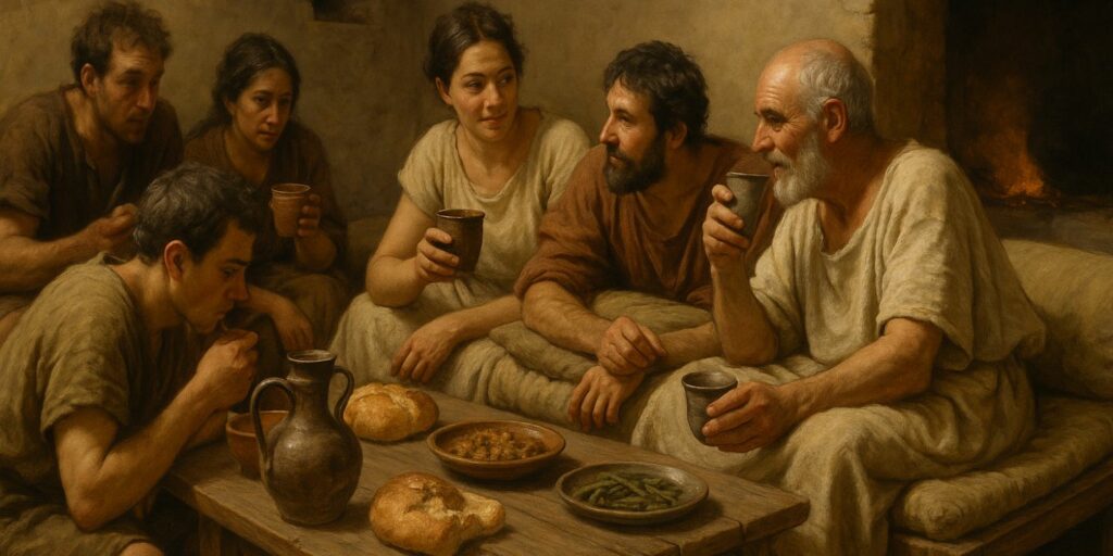 L’atmosphère de ces repas était souvent détendue, bien que respectueuse des codes. Des jeux, des devinettes ou des poèmes improvisés pouvaient animer la soirée. Certains hôtes faisaient appel à des artistes ou à des esclaves instruits pour divertir leurs invités et maintenir l’attention jusqu’à la fin du banquet.