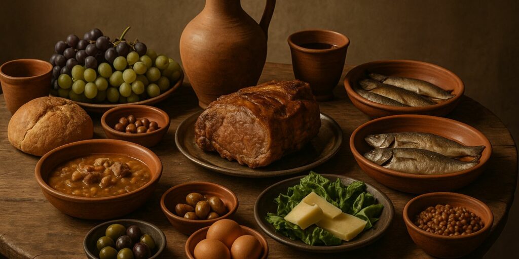 La diversité des plats à la table romaine dépendait avant tout des moyens financiers. Dans les foyers modestes, les repas restaient simples : un ragoût d’épeautre, des légumes de saison, un peu de fromage, parfois un poisson séché. Ces mets, bien que frugaux, assuraient une alimentation équilibrée et suffisante pour les travailleurs.
